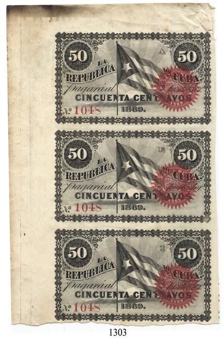 Cuba, uncut set of 3 banknotes of 50 centavos each, 1869. 4" x 6". Partial sheet of 3 uncut notes of 50 centavos each printed in black with red seals and serial numbers (1048 on all three, but the 3 bills differentiated by letters A, E and I), with Cuban flag design, VF with discoloration in one corner and wrinkling in another, rare as unissued.