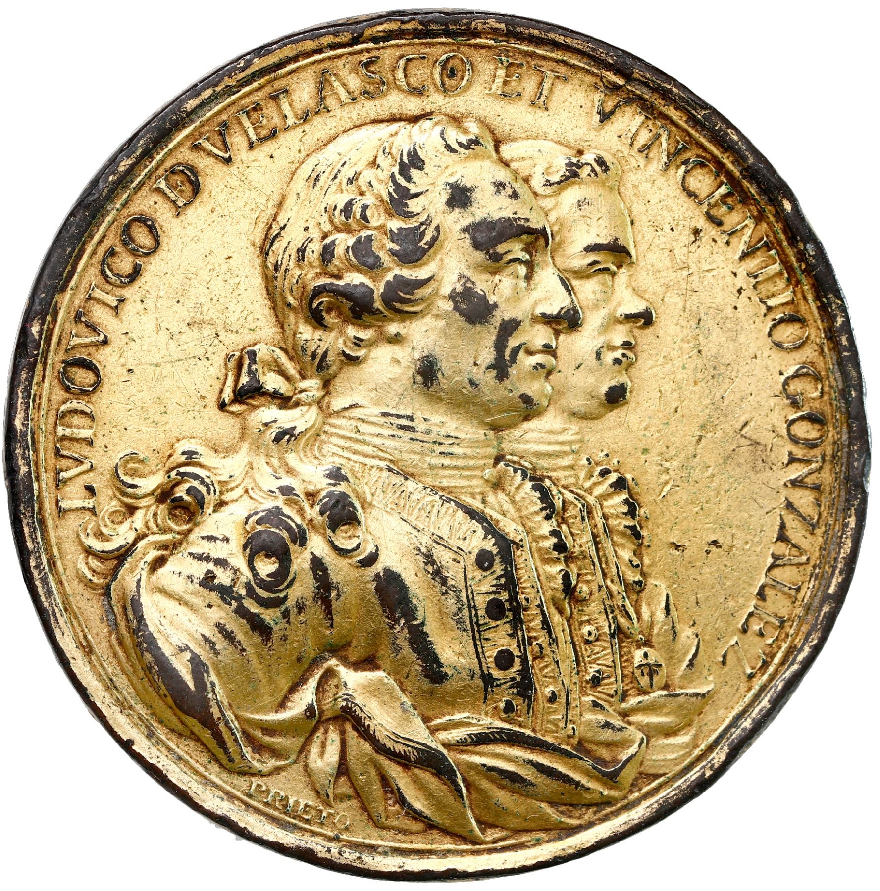 Cuba (under Spain), gilt bronze medal, 1763, capture of Morro Castle (Havana) and deaths of Don Luis de Velasco and Vincenzo Gonzales, by T.F. Prieto. Betts-443; Eimer-704; Medina-12. 51.94 grams; 50 mm. Obverse with two busts above PRIETO inside legend LVDOVICO DE VELASCO ET VICENTIO GONZALEZ; reverse with explosion emanating from fortress within a naval battle scene below legend IN . MORR . VIT . GLOR . FUNCT ., exergue with ARTIVM ACADEMIA / CAROLO REGE CATHOL / ANNVENTE CONS. / A MDCCLXIII. This medal is typically filed under Cuba due to the location of the battle it depicts, but its manufacture was in Spain, and the commemoration is actually of a British victory, the capture of Morro Castle in Havana, on July 30, 1763, during the French and Indian War, resulting in the deaths of the Spanish officers shown on the obverse. This example rates XF or better, with bright gold plating almost completely covering the surfaces, the original dark brown peeking out only on high points.