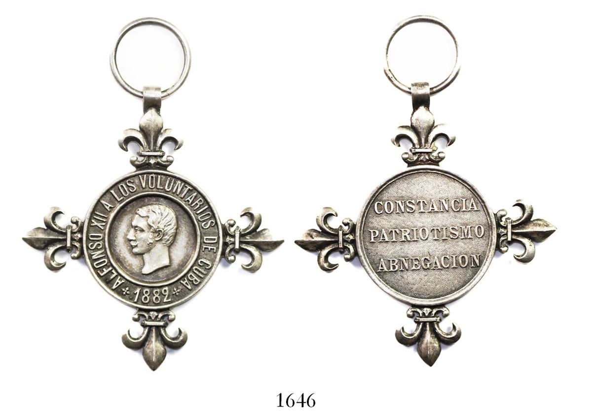 Cuba (under Spain), silver medal, 1882, Alfonso XII, Volunteers, with fleurs at 4 points and loop at top. 12.75 grams. Obverse with portrait of king inside legend ALFONSO XII A LOS VOLUNTARIOS DE CUBA 1882; reverse with 3-line inscription CONSTANCIA PATRIOTISMO ABNEGACION; nicely toned UNC, popular issue.