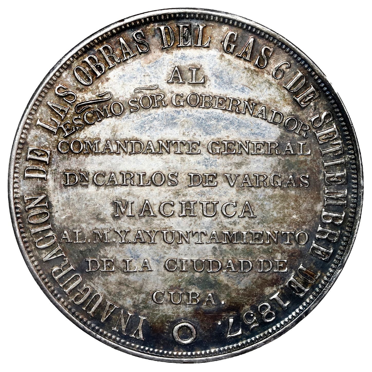 Cuba (under Spain), silver medal, Isabel II, 1857, inauguration of the gas plant in Santiago de Cuba. 23.22 grams; 40mm. Obverse with LA EMPRESA DE GAS DE SANTo DE CUBA around A LA REINA / AL ESCMO SOR CAPn GENl / Dn JOSE DE LA CONCHA / MARQUES DE LA HABANA / VIZCONDE DE CUBA; reverse with YNAUGURACION DE LAS OBRAS DEL GAS, 6 DE SETIEMBRE DE 1857 around AL ESCMO SOR GOBERNADOR / COMANDANTE GENERAL / Dn CARLOS DE VARGAS / MACHUCA / AL.M.Y. AYUNTAMIENTO / DE LA CIUDAD DE / CUBA. Mirrored prooflike UNC with strong rainbow toning at rims, a few wispy hairlines in the fields.