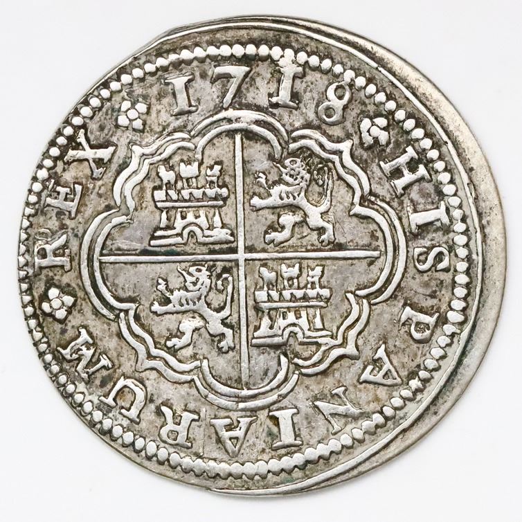 Cuenca, Spain, milled 2 reales "pistareen," Philip V, 1718JJ. CT-1161; KM-308. 5.47 grams. XF, small planchet flaw at 6 o'clock on obverse.