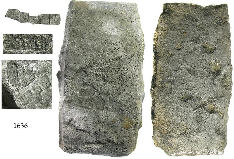 Cut silver "tumbaga style" ingot #6 from the "Golden Fleece wreck" (ca. 1550), 2495 grams, with illegible fineness markings and tax stamp. About 5-1/2" x 2-3/4" x 1-1/2". An odd item for this wreck, whose silver yield was almost entirely round "splash" ingots, this piece instead being the middle portion of a big, rectangular "tumbaga" ingot from a few decades prior, the two cuts (about 1/3 chiseled and 2/3 broken) clear on the wide ends, the fineness marked on both sides (one with circular tax stamp as well) but illegible due to corrosion, very heavy and bricklike. From the "Golden Fleece wreck" (ca. 1550).