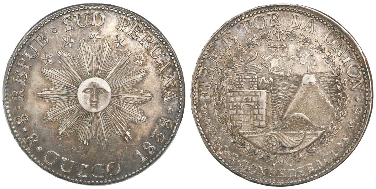 Cuzco, Peru, 8 reales, 1838MS. KM-170.4. 26.10 grams. XF+ with light friction wear on highest points but original surfaces, deeply toned with hints of underlying luster.
