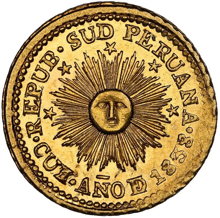 Cuzco, Peru (Republic of South Peru), gold 1/2 escudo, 1838 MS, very rare, NGC MS 63. KM-173; Fr-94. The perfect companion-piece to the previous lot, as the design and quality are nearly identical, this one perhaps a hair bolder in strike and stronger in luster but with slightly cruder rim, also with fascinating strike-through error in center of reverse where debris (fibers and grease) were not removed from the die before striking. Pedigreed to the Biur Collection.