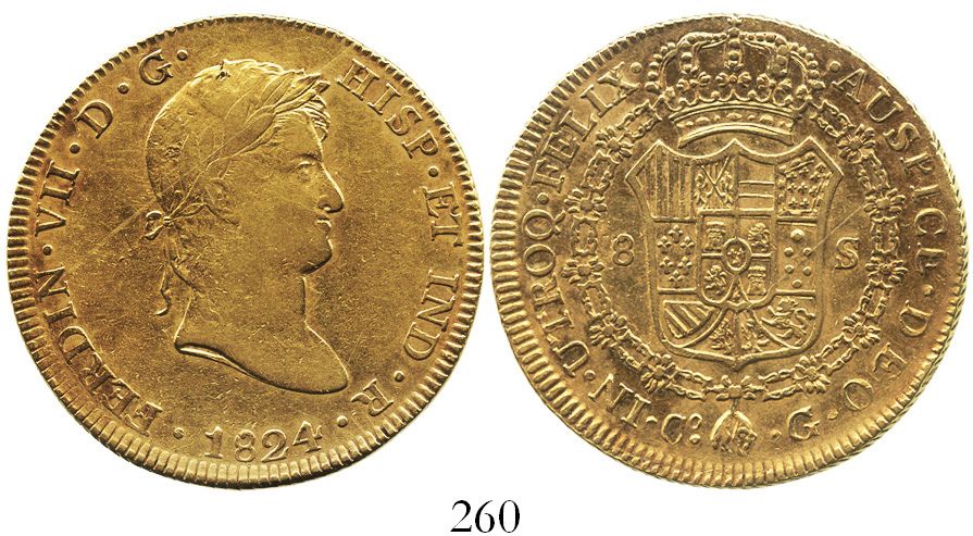 Cuzco, Peru, bust 8 escudos, Ferdinand VII, 1824G, rare one-year issue. KM-129.2; CT-4. 26.9 grams. Nice XF/AU, the obverse lightly polished but the reverse red-toned and lustrous (very attractive), popular type and a good example without any big flaws.