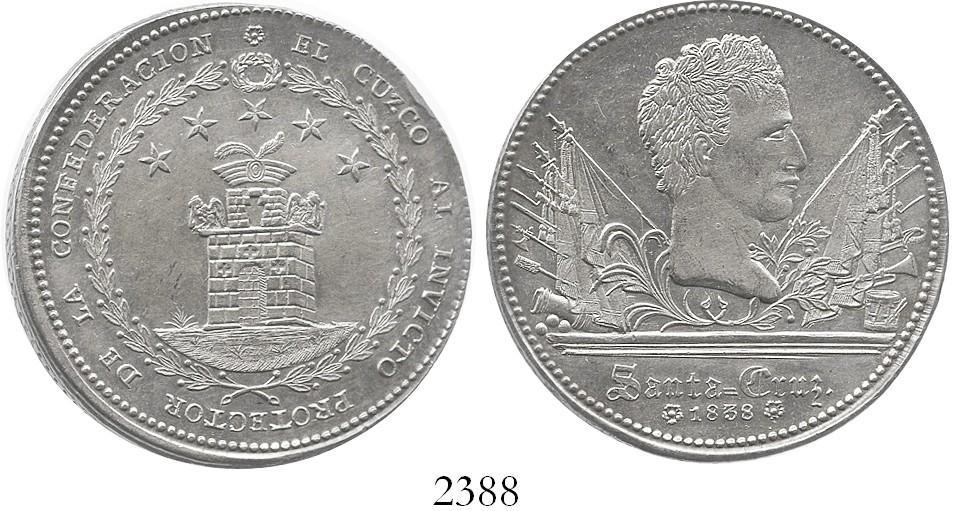 Cuzco, Peru, silver "8 reales" medal, 1838, General Santa Cruz. 28.3 grams. Lustrous, lightly cleaned UNC, no toning, castle side slightly off-center (with resulting crudeness on part of rim).