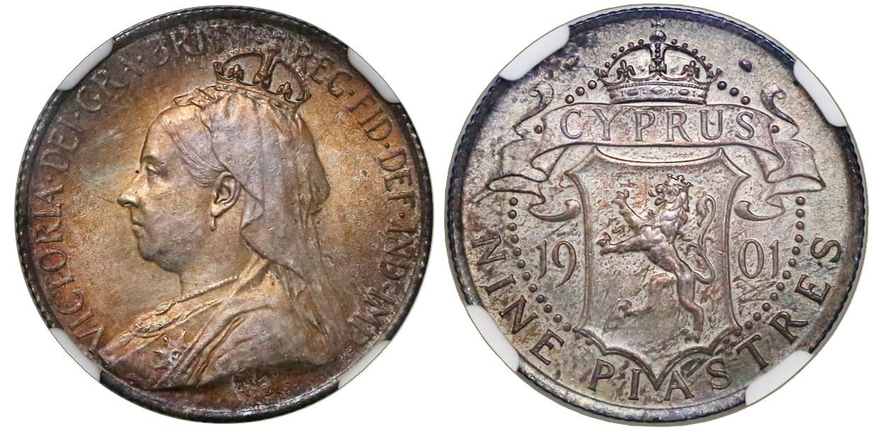 Cyprus, 9 piastres, 1901, Victoria, NGC MS 62.