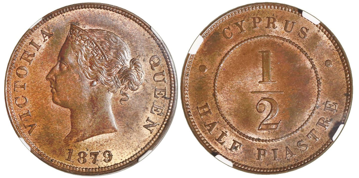 Cyprus, bronze 1/2 piastre, Victoria, 1879, NGC MS 64 BN. KM-2. Cyprus went to British administration in 1878 after the Russo-Turkish War; coins for the Cypriot pound entered circulation the following year. Smooth, semi-lustrous surfaces, mostly brown toned with some areas of original mint red color. NGC #4687760-013.