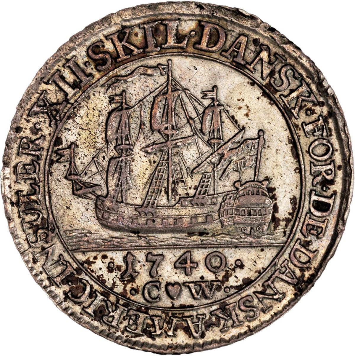 DANISH WEST INDIES, Copenhagen mint, 12 skilling, Christian VI, 1740 CW, PCGS AU53. KM-4. Light green-gold toning over muted luster with darker splotches in peripheries, popular type with ship sailing above date and mintmaster Christian Wineke's initials flanking a heart.