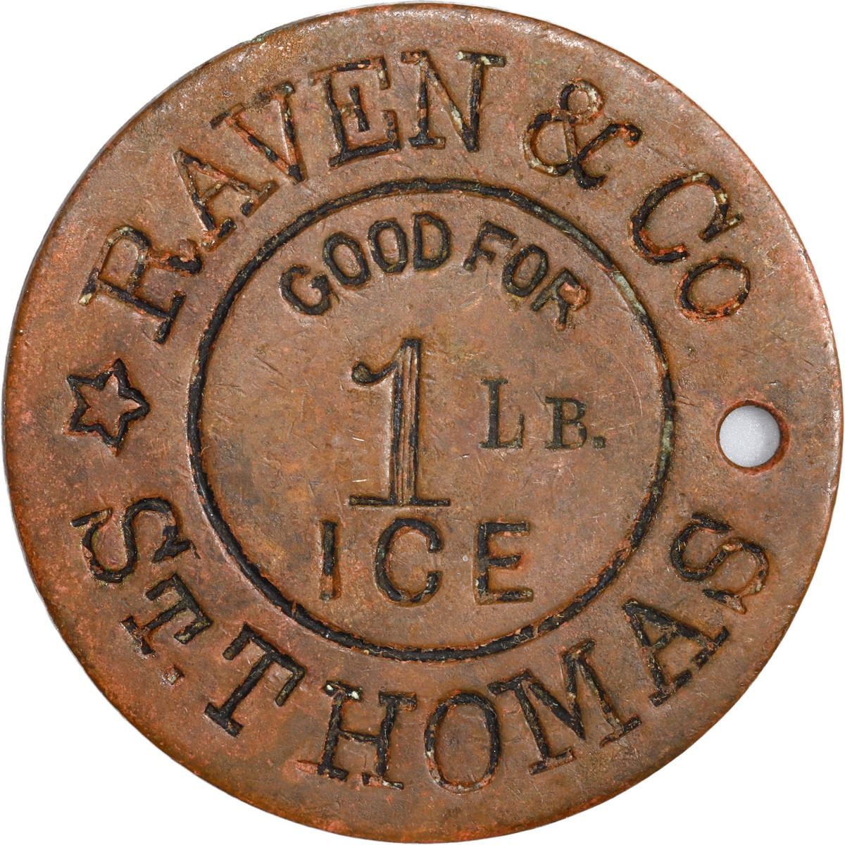 DANISH WEST INDIES, St. Thomas, brass uniface token for 1 lb of ice, ca. 1890. Sieg-74; JS-4681. 9.72 grams. XF token with bold incuse lettering with some darkening, holed on edge at 3 o'clock (as made), quite rare.