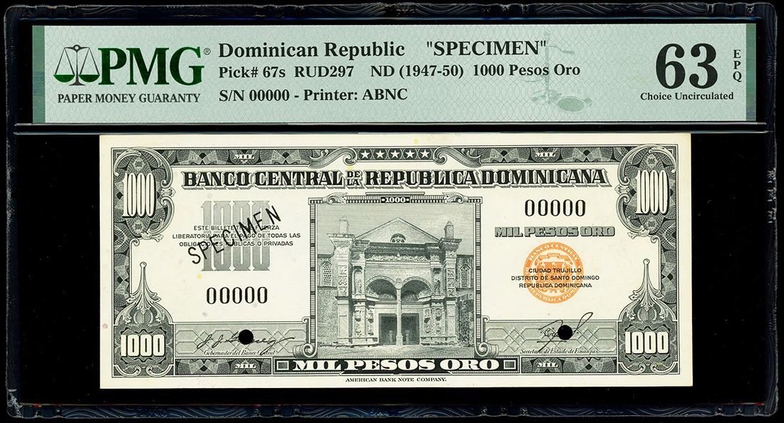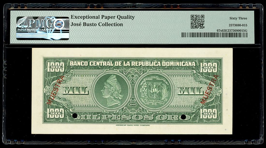 DOMINICAN REPUBLIC, Banco Central, 1000 pesos oro specimen, (1947), with black SPECIMEN overprint on front, red MUESTRA overprint on back, PMG Choice UNC 63 EPQ, ex-Busto. Rudman-297; Pick-67s. Well-printed, high-denomination specimen note with great ink colors and paper quality, two punch hole cancellations at signatures. Pedigreed to the José Busto Collection (stated on label).
