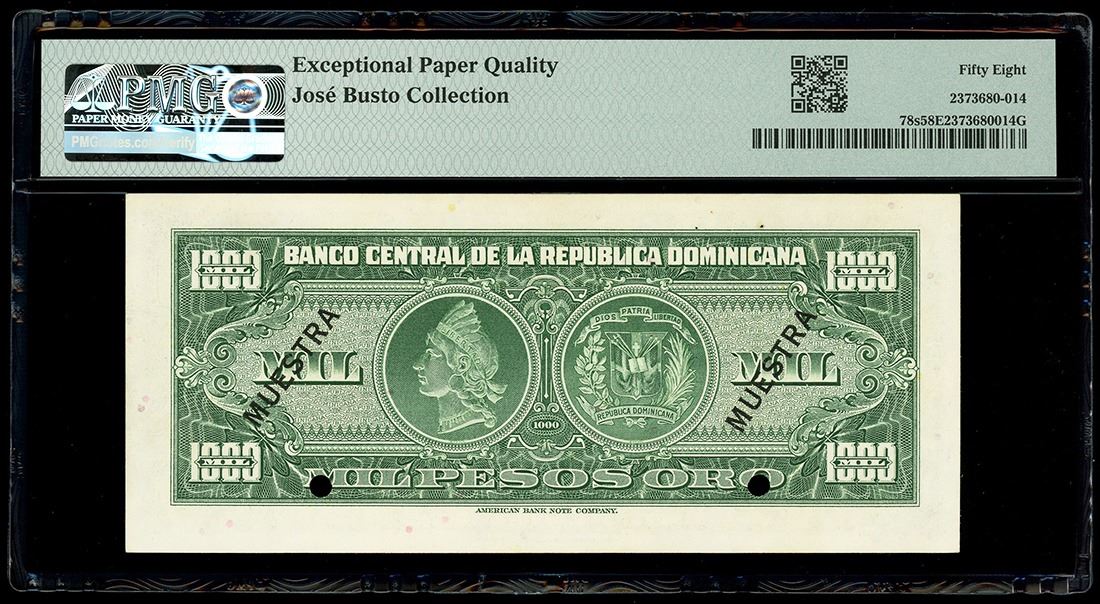 DOMINICAN REPUBLIC, Banco Central, 1000 pesos oro specimen, (1957), with black MUESTRA overprint, PMG Choice AU 58 EPQ, ex-Busto. Rudman-309; Pick-78s. Incredible embossing and great ink colors are seen on this high-denomination specimen note, two punch hole cancellations at signatures, staple holes at top left. Pedigreed to the José Busto Collection (stated on label).