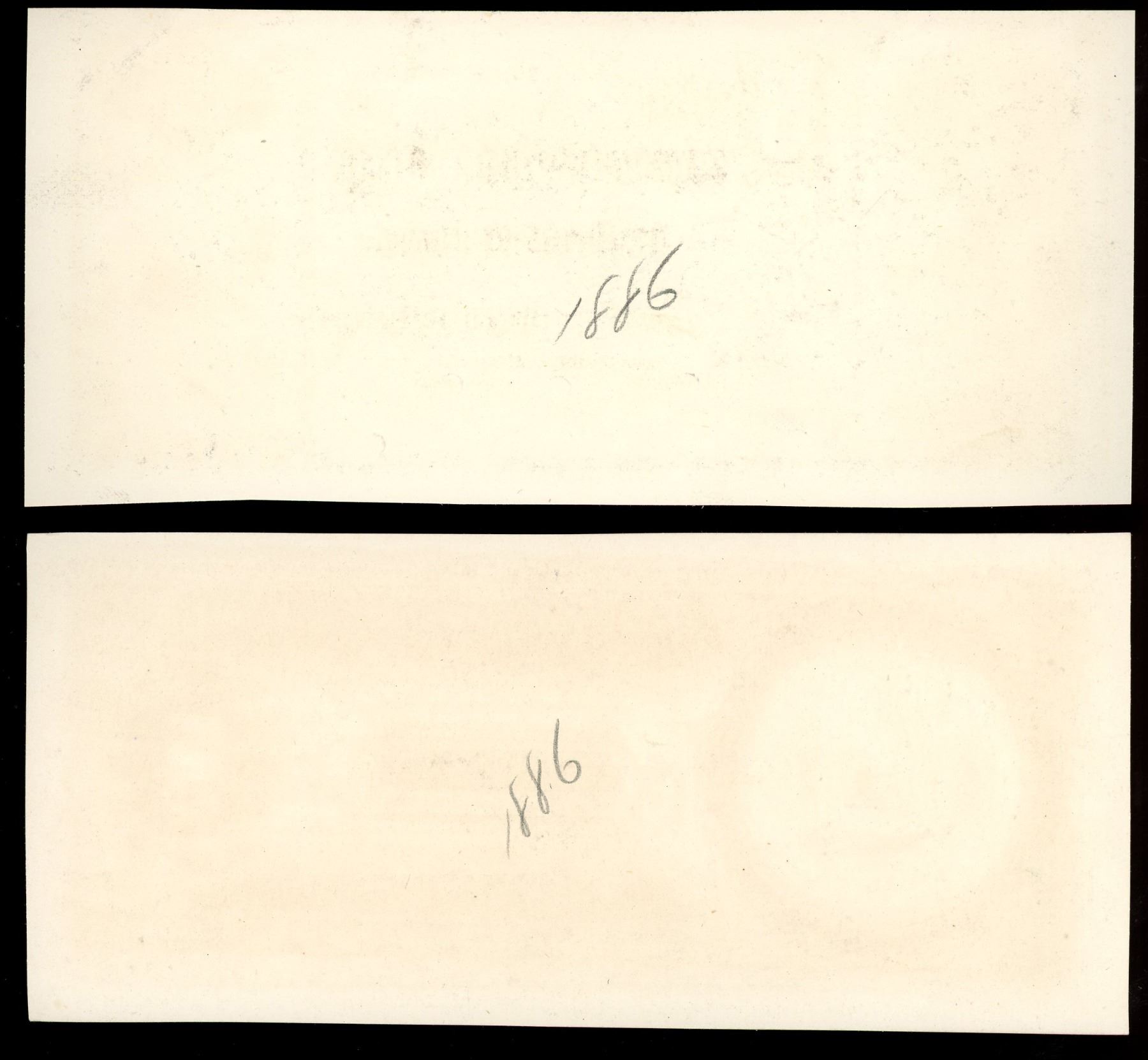 DOMINICAN REPUBLIC, Puerto Plata, Banco de la Compañía de Crédito de Puerto Plata, 5 pesos obverse and reverse proofs, no date (1880-89). Pick-S105p; Rudman-163. Five POCs. Popular and colorful bank note design from this Dominican private bank. Choice UNC, both sides mounted on separate pieces of cardstock with "1886" penciled on the back.