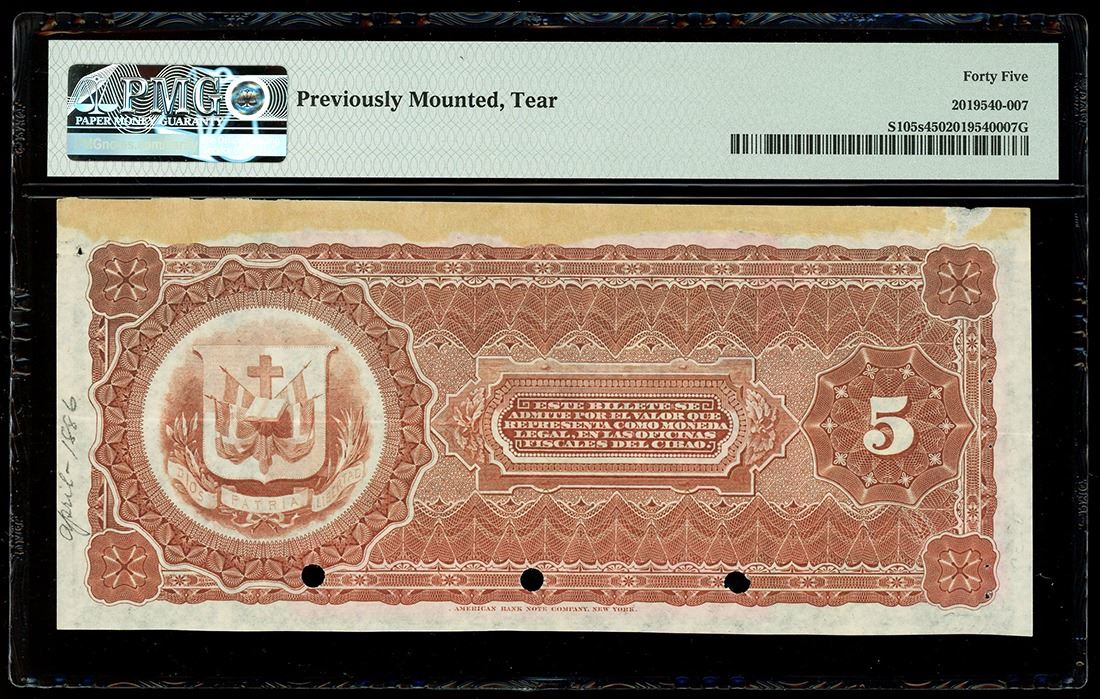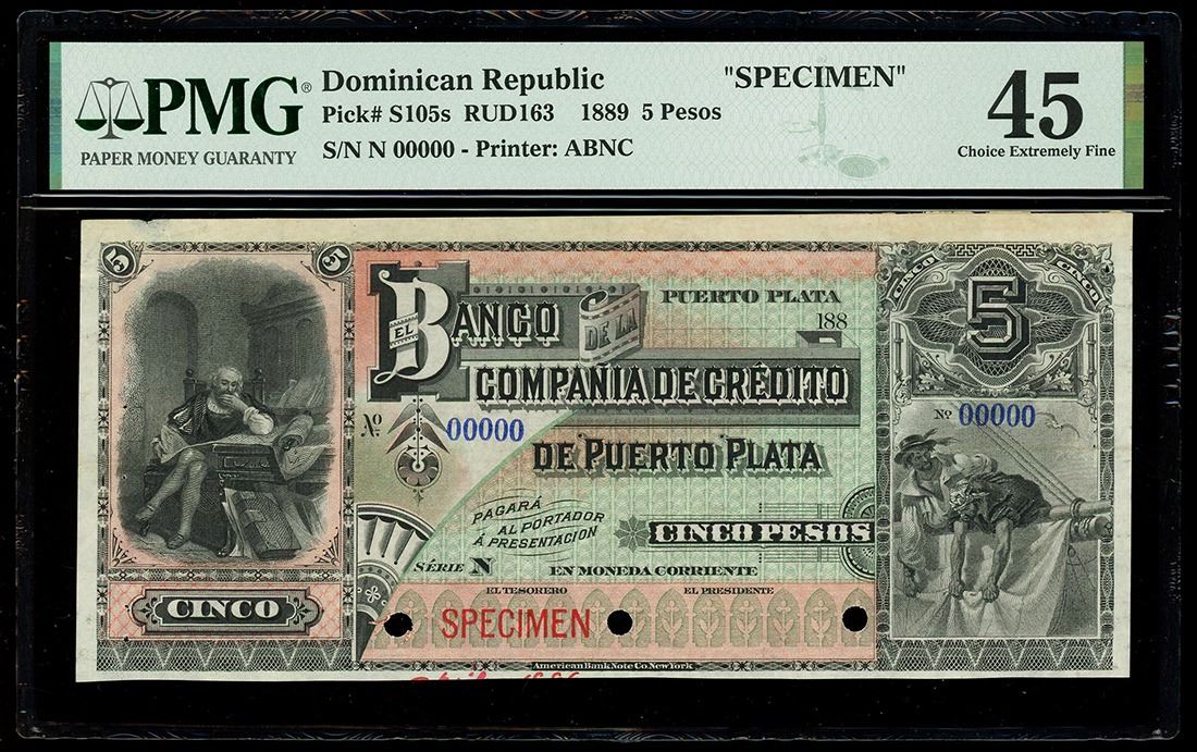 DOMINICAN REPUBLIC, Puerto Plata, Banco de la Compañía de Crédito de Puerto Plata, specimen 5 pesos, (1889), series N, PMG Choice XF 45. Rudman-163; Pick-S105s. Three POCs. Colorful specimen example of a popular Dominican private bank note. Mounting remnants and small tear in top margin of the back, pencil annotation in left margin as well as a few pinholes.