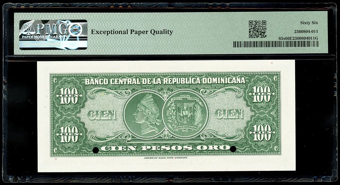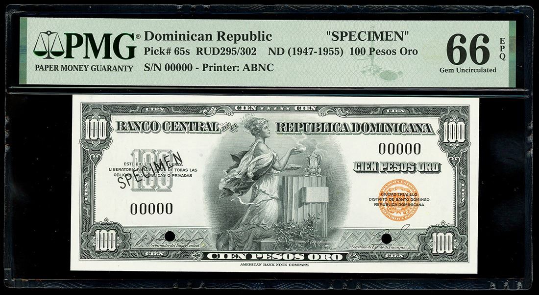 DOMINICAN REPUBLIC, Santo Domingo, Banco Central de la República Dominicana, specimen 100 pesos oro, (1947-50), PMG Gem UNC 66 EPQ, "top pop." Rudman-295/302; Pick-65s. Two POCS. Popular Dominican note with a woman holding a cup of coffee as the central vignette, tied with four others for finest known in the PMG census.