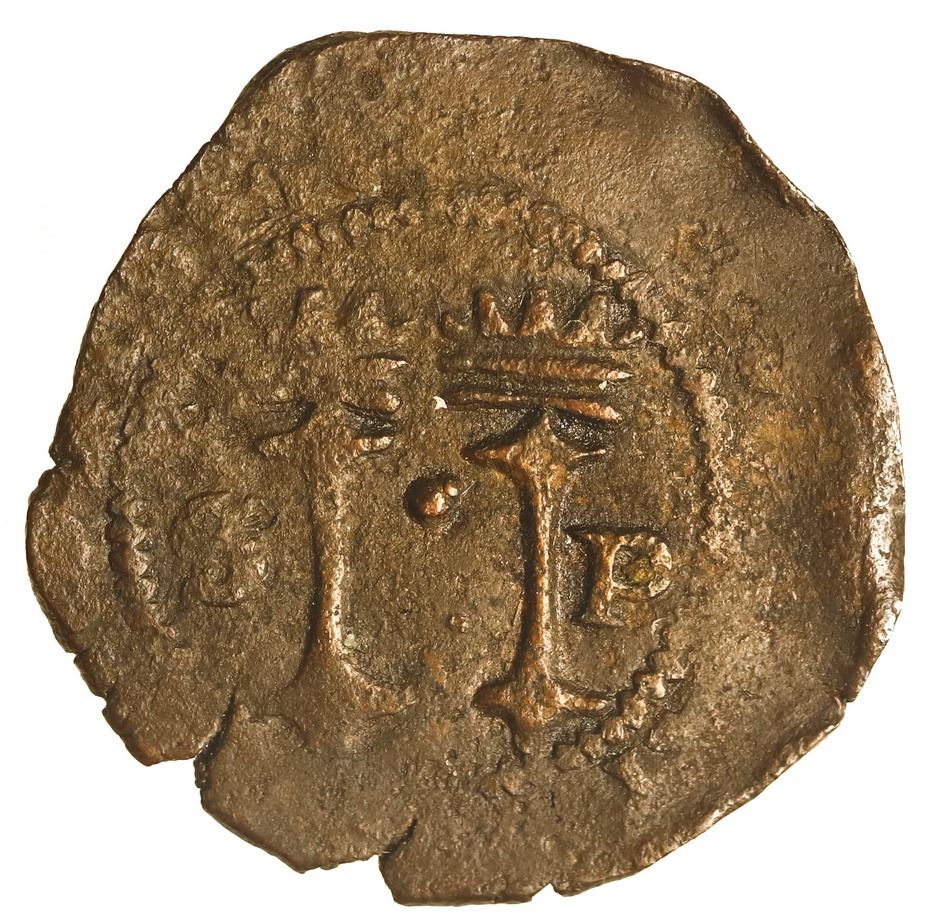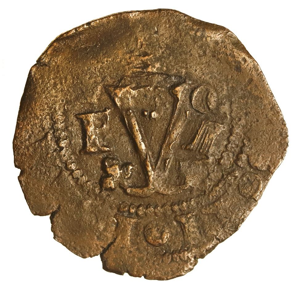 DOMINICAN REPUBLIC, Santo Domingo, copper 4 maravedís, Charles-Joanna, assayer F to left, denomination o-IIII to right. S-SD1; Cal-33. 2.99 grams. XF with some bold central design, weak legends as struck, light surface porosity and several edge-cracks (as made).