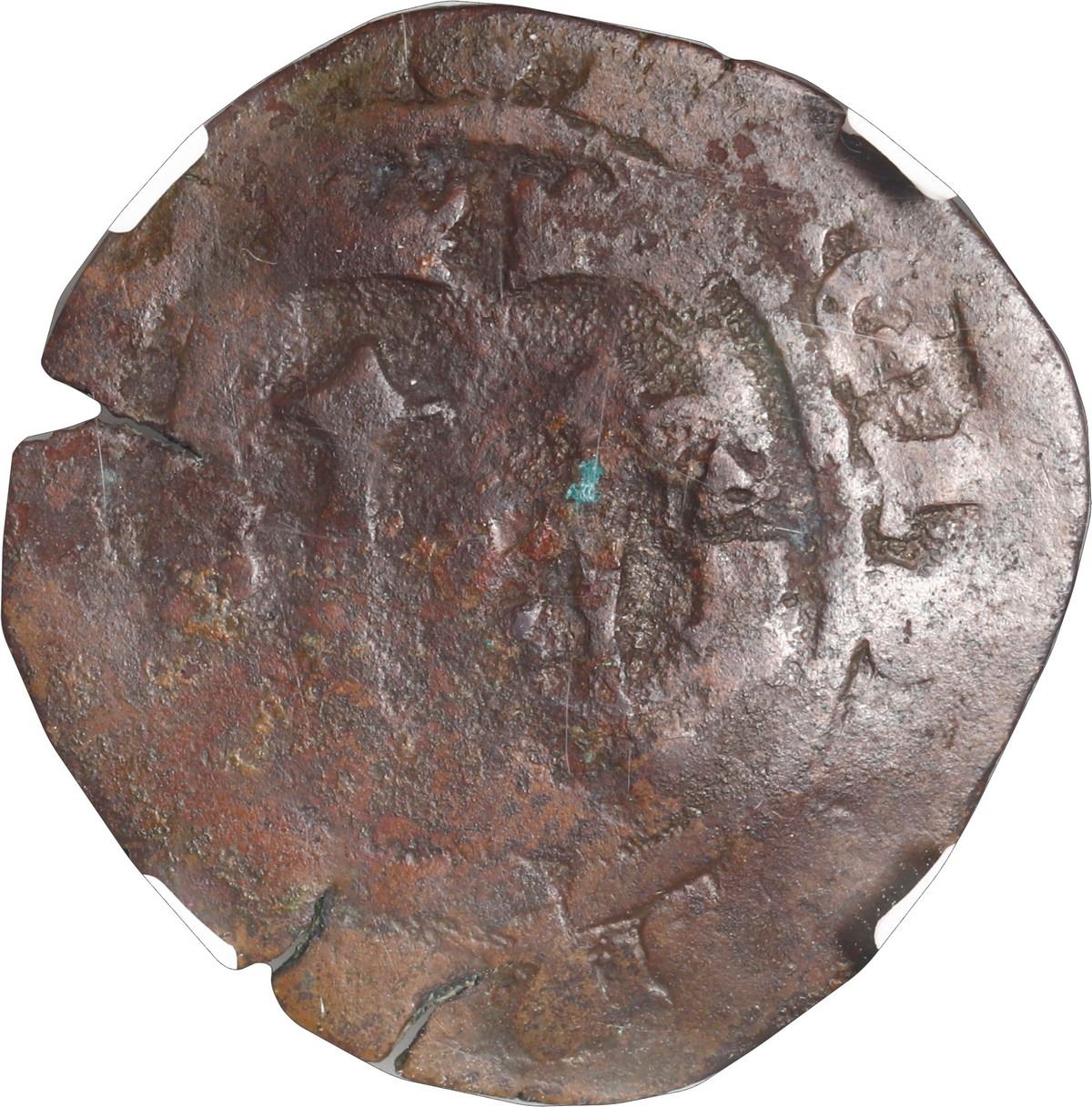 DOMINICAN REPUBLIC, Santo Domingo, copper 4 maravedís, Charles-Joanna, assayer F, with key (revaluation to 2M, 1577) and anchor (Jamaica, 1611-16) countermarks, NGC VG 8 BN, ex-Busto. Cal-84; host: S-SD1; Cal-Type 14. Rare set of two different countermarks indicating its circulation in two countries some 35-40 years apart. Both countermarks boldly struck into the same side, rather dark surfaces, a few natural edge-cracks, incorrectly labeled as a 2 maravedís on the slab. Pedigreed to the José Busto Collection.