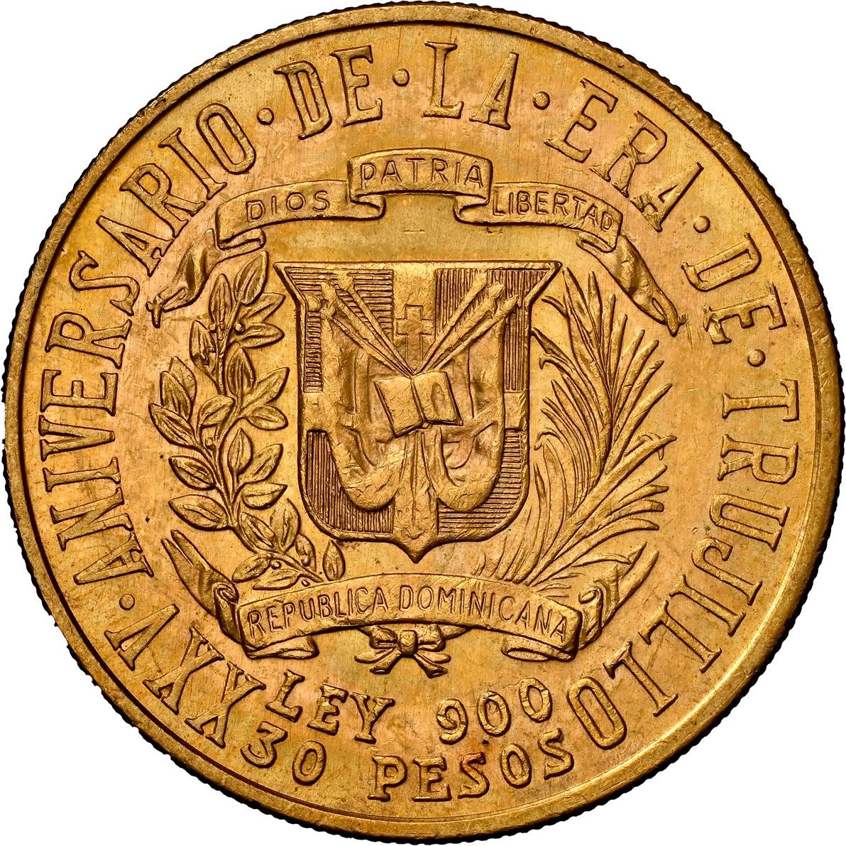 DOMINICAN REPUBLIC, Santo Domingo, gold 30 pesos, 1955, 25th anniversary of the Trujillo era, NGC MS
