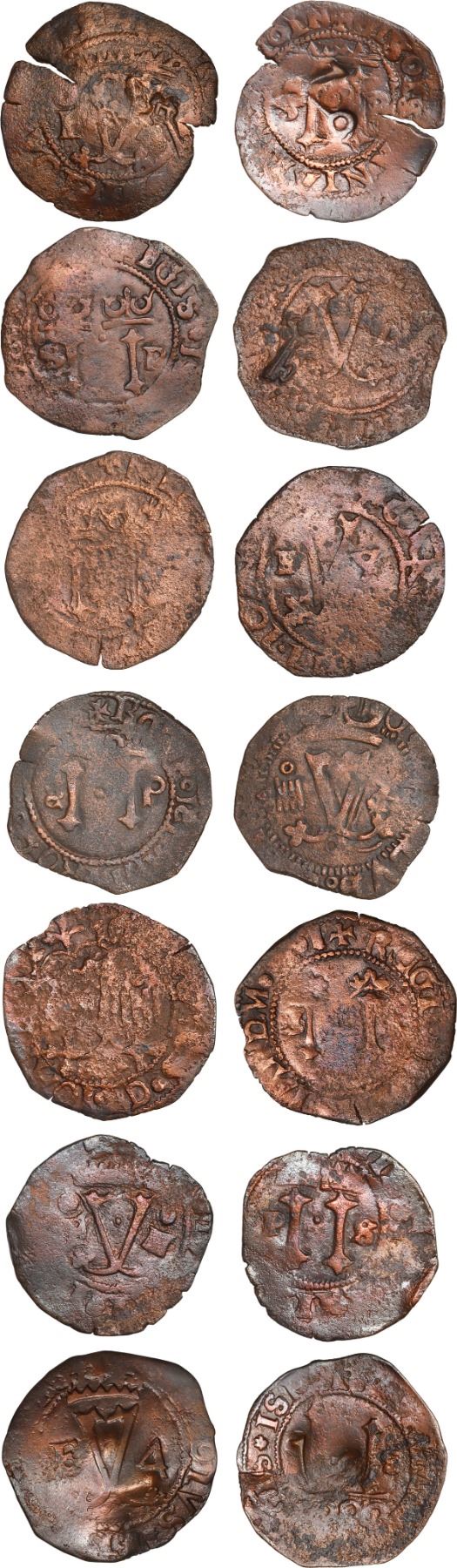 DOMINICAN REPUBLIC, Santo Domingo, lot of seven copper 4 maravedís, Charles-Joanna, assayers F or oF (where visible), three with countermarks (one key and two anchors). S-SD1. 20.50 grams total. Excellent group for studying several different types of this copper small denomination which circulated about the Caribbean in the 1500s and 1600s. All with some design elements showing and several with bold countermarks, most with some copper red color from cleaning.