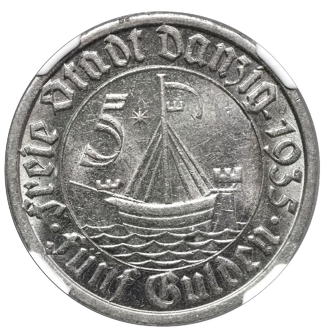 Danzig (Poland), nickel 5 gulden, 1935, NGC MS 62. KM-158. Lustrous and lacking wear but with lightly marked surfaces.