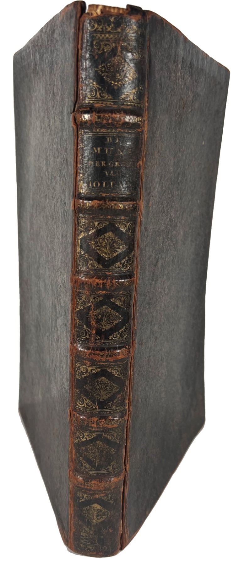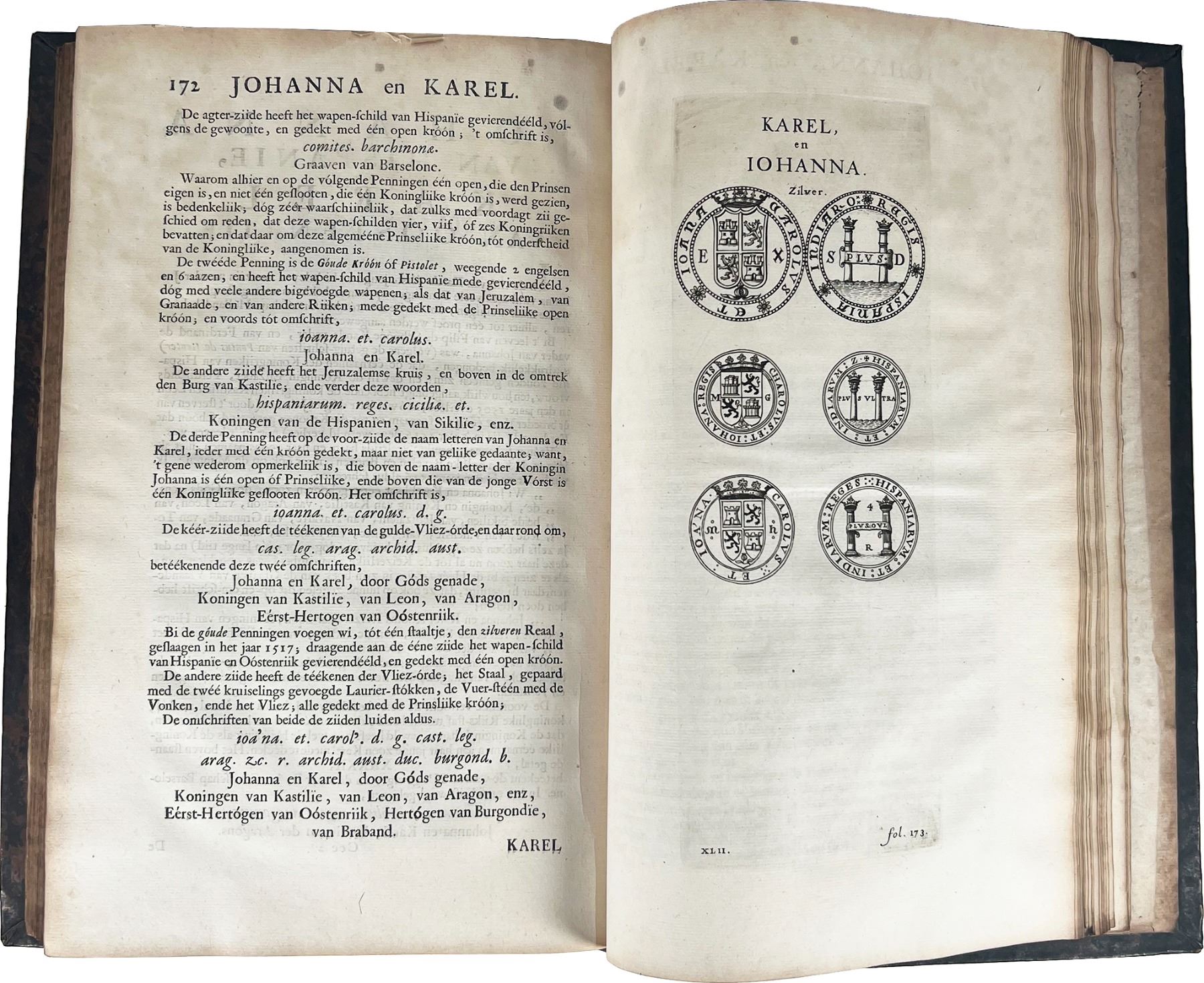 De Munt der Graaven van Holland [The Coins of the Counts of Holland], by Kornelis Van Alkemade, 1700. 12¾" x 8¼". An important work of early coin drawings, particularly useful to collectors of colonial Santo Domingo coinage as it contains a plate drawing of the extremely rare 10 reales coin of Charles-Joanna, a redrawing from an earlier work by Plantin and Parijs in 1576. According to John Kleeberg in his paper "The 10 Reales of Santo Domingo," the Plantin and Parijs drawing lends credence to the existence of the coin as a genuine product of the Santo Domingo Mint. As Kleeberg notes, Alkemade's purpose was to publish a book about gold and silver medals (and coins) of the counts of Holland, so he included the 10 reales of Santo Domingo because it had been issued under the Spanish rulers Charles I and (his mother) Joanna, with Charles also being a Count of Holland. Fine, (24) 192pp. (8), worn leather hardcover binding.