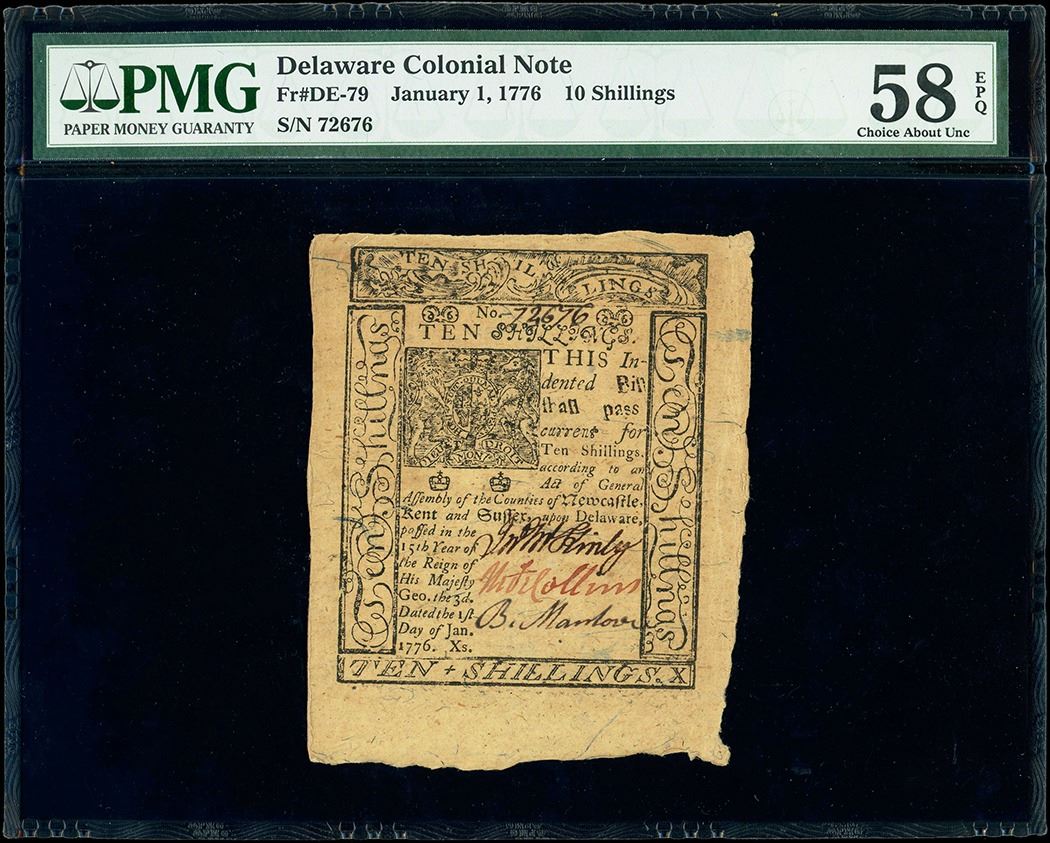 Delaware, General Assembly, 10 shillings, January 1, 1776, serial 72676, PMG Choice AU 58 EPQ. Fr-DE-79. Nice example of a colonial Delaware type note printed by James Adams just a few months prior to the Declaration of Independence when references to "the Reign of His Majesty Geo. the 3d. (George the Third)" were still found on bank notes. On the reverse, underneath a sheaf of wheat vignette, the note bears the common warning found on colonial notes: "To Counterfeit is Death." It is clear this note was printed on the bottom right corner of a sheet as the right and bottom margins are particularly wide and show some crudity from the paper manufacture process of the time; trivial handling is noted in the right margin yet does not affect the design itself, the printing as well as the penned serial and signatures very bold. PMG #1022232-007.