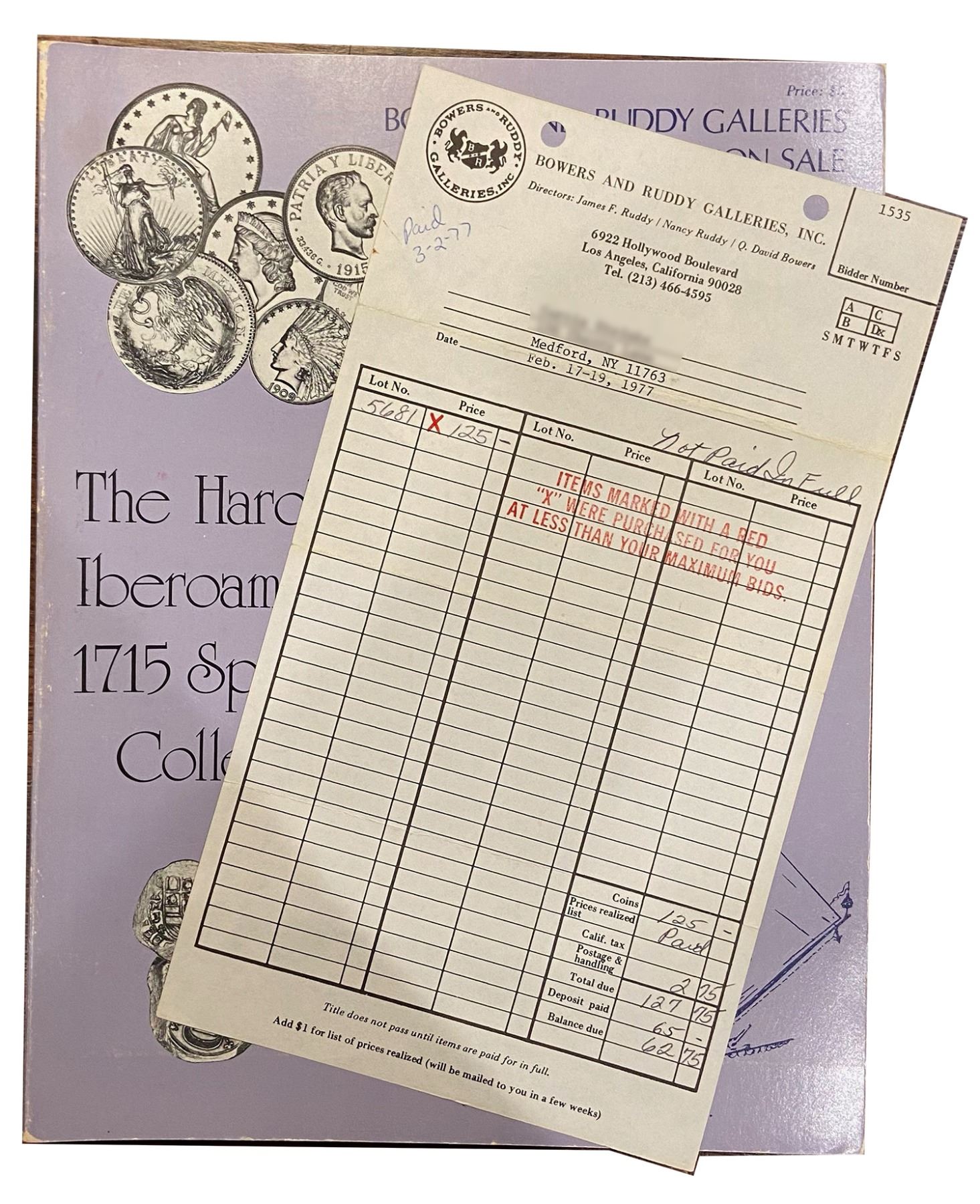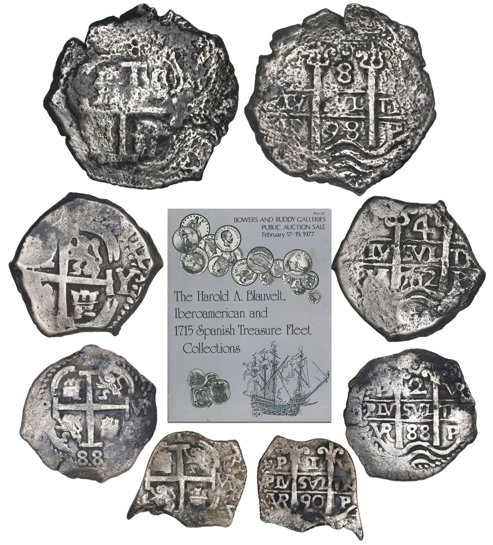 Denomination set of four Potosi, Bolivia, cob 8, 4, 2 and 1 reales (1698F, 1702Y, 1688VR and 1690VR respectively), ex-Bowers and Ruddy (1977). 43.19 grams total. Very hard-to-replicate Potosi denomination (short) set from this wreck, all with clear dates, the 8R with bold full pillars-and-waves, the 4R choice (no corrosion), the 2R and 1R both thin but with both sides full (the 1R an interesting shape), all toned, with a classic provenance to boot. Pedigreed to the Bowers and Ruddy auction of February 1977 (lot #5681), with catalog for that auction and original invoice. Recovered from: Spanish 1715 Fleet, east coast of Florida