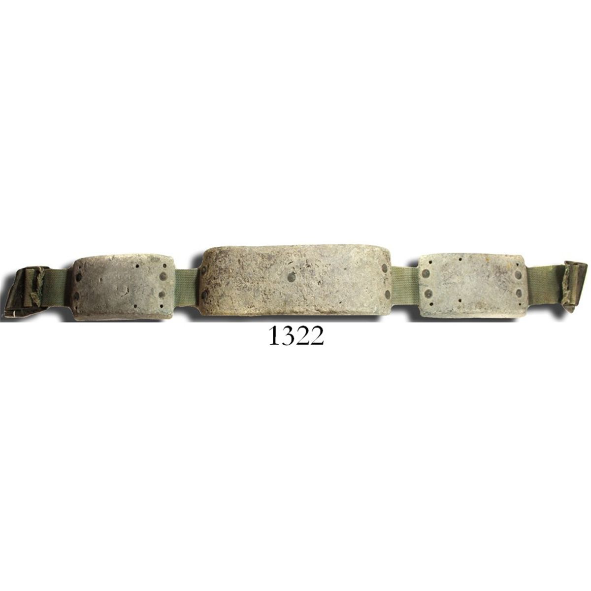 Dive belt made from lead sheathing from the ship, as pictured in Flash of Gold. 18 lb, 35" long, each weight 3-1/3" wide. In a stroke of 20th-century ingenuity, Marty melted down pieces of the ship's lead sheathing and molded it into three form-fitting weights, which he attached with brass rivets to a canvas belt with plastic fastener, now a vintage relic with added significance. Pedigreed to the Marty Meylach collection, and pictured in his book. Recovered from:Spanish 1733 Fleet, Florida Keys