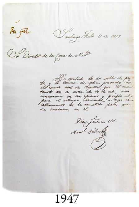 Document from 1849 from Santiago, Chile, signed by General Manuel Búlnes. 8-1/8" x 11-3/4". Brief, one-page letter in choice condition dated July 11, 1849, by the President of Chile (General Búlnes) thanking the director of the mint for donating 2 silver-coin dies and 1 copper sheet engraved with the Spanish royal shield to the national museum.
