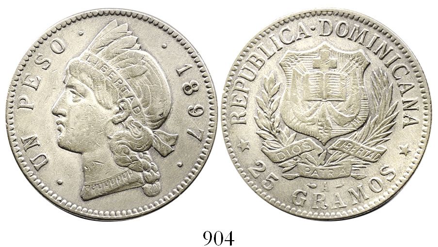 Dominican Republic, 1 peso, 1897. KM-16 24.89 grams. Matte AXF with faint toning on reverse.