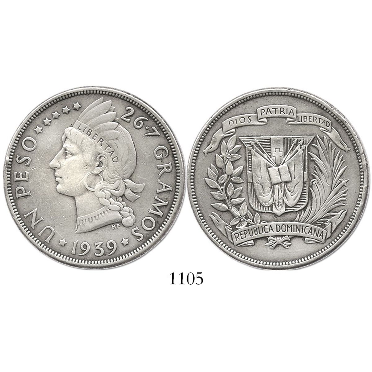 Dominican Republic, 1 peso, 1939. KM-22. 26.6 grams. Bold AXF with lightly cleaned fields, toned around details, low-mintage issue.
