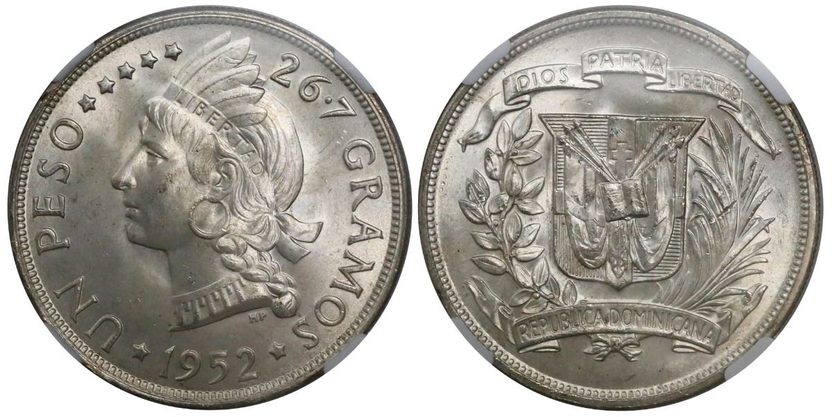 Dominican Republic, 1 peso, 1952, encapsulated NGC MS 65. KM-22. Blast-white example, significant luster.