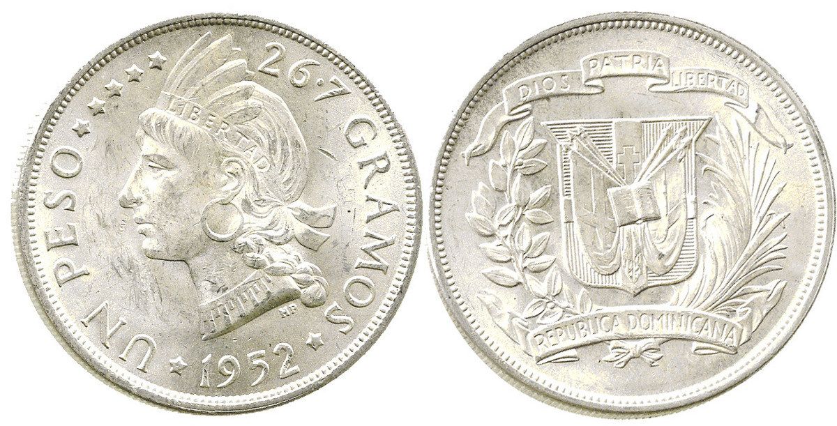 Dominican Republic, 1 peso, 1952. KM-22. 26.7 grams. Mint State with bagmarks (including a prominent one behind the head), lustrous and non-toned.