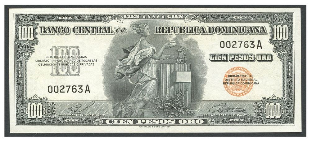 Dominican Republic, Banco Central de la Republica Dominicana, 100 pesos oro, no date (1947), serial 002763A. Pick-65a. Crisp UNC, no issues.