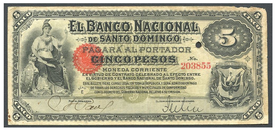 Dominican Republic, El Banco Nacional de Santo Domingo, 5 pesos, no date (1889), series E, serial 20