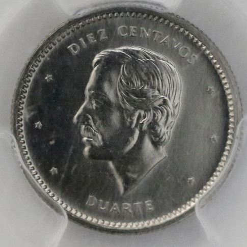 Dominican Republic, copper-nickel 10 centavos, 1987, PCGS SP66, ex-King's Norton (stated on label). KM-60. Tied one other for finest known in the PCGS census, none listed in NGC census. Lustrous with smooth, well-struck surfaces. PCGS #81311669.