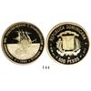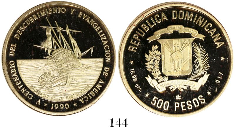 Dominican Republic, proof 500 pesos, 1990, in original display case with certificates. KM-79. 4" x 3-1/2". Choice Proof, with arms on obverse and V CENTENARIO DEL DESCUBRIMIENTO Y EVANGELIZACION DE AMERICA (Fifth Centennial of the Discovery and Evangelization of America) around a scene of the sinking of Columbus' ship Santa Maria, from a mintage of only 1500 pieces, struck only in Proof.
