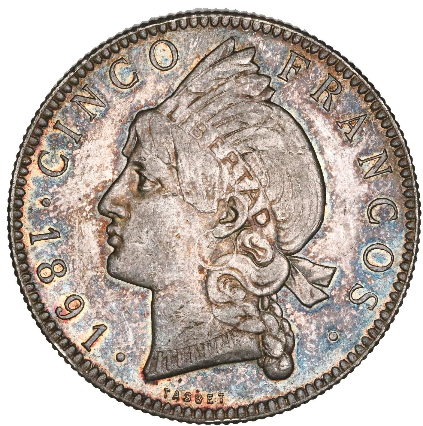 Dominican Republic (struck at the Paris mint), 5 francos, 1891-A, NGC AU 58.