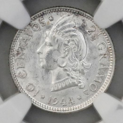 Dominican Republic (struck at the Philadelphia Mint), 10 centavos, 1944, NGC MS 64.