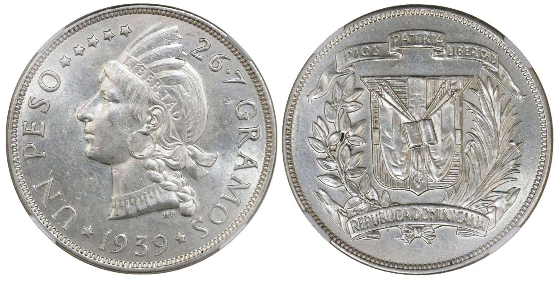 Dominican Republic (struck at the Philadelphia mint), 1 peso, 1939, NGC AU 58.