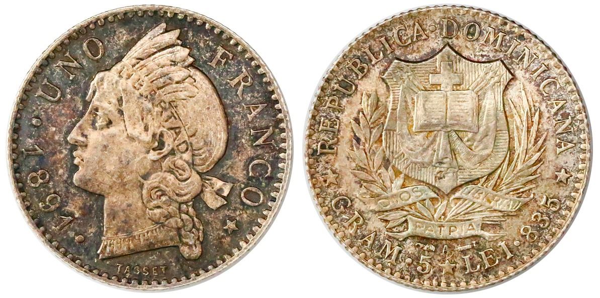 Dominican Republic (struck in Paris), 1 franco, 1891-A, NGC MS 64. KM-11. 5.01 grams. Attractively toned over nice muted luster, no marks or wear. NGC #2741459-004.