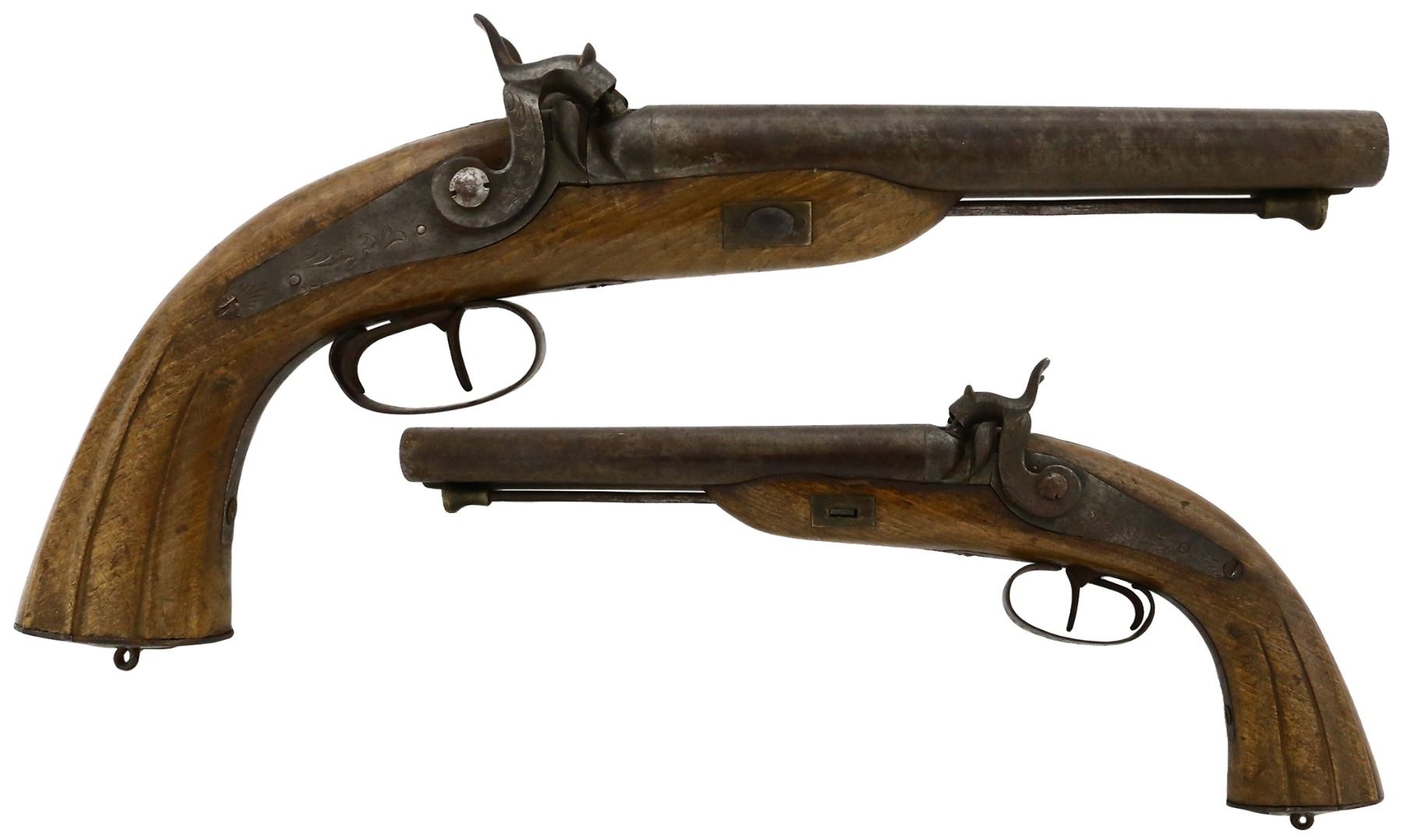 Double-barrel side-by-side percussion pistol, probably British, ca. 1820s-1850s.