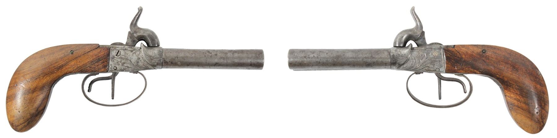 Double-barreled percussion pistol, 1800s. 459 grams, 8-1/2" long, 3-1/4" barrel. When one barrel won't do the trick! Double-barreled compact pistol of medium-colored striated wood stock, metal fittings and barrel with pretty floral engravings, lacking maker's mark, somewhat rusty in places.