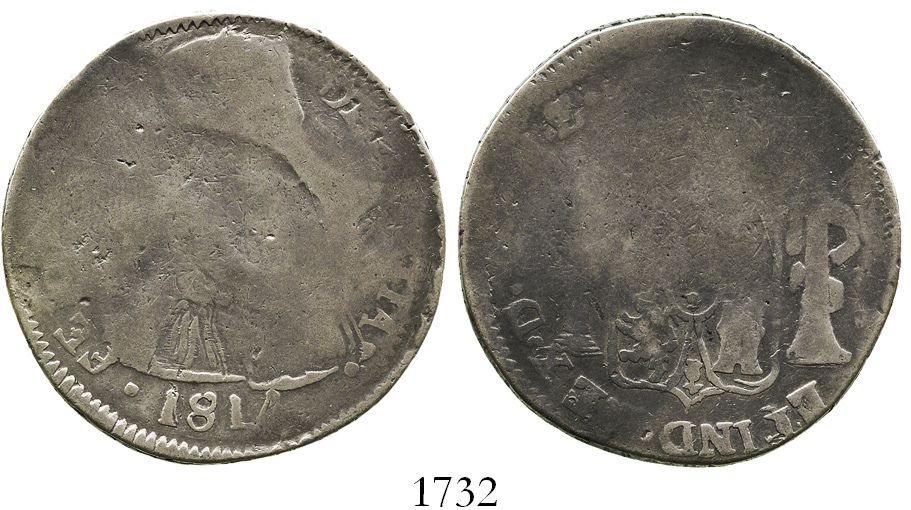 Durango, Mexico (War of Independence), bust 8 reales, Ferdinand VII, 1814MZ, very rare with "armored" bust. KM-110.1. 26.6 grams. Weakly struck all over except at date below the king's armor, lightly toned Good overall, not a very pretty coin but important for the War of Independence specialists. Pedigreed to our Auction #7, with original lot-tag #1527.