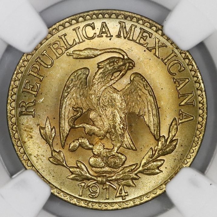Durango, Mexico, brass 5 centavos, 1914, NGC MS 65. KM-634. Tied with three others for finest known in the NGC census. Satiny surfaces with minimal marks, bright brass color with red toning around eagle. NGC #4738965-014.