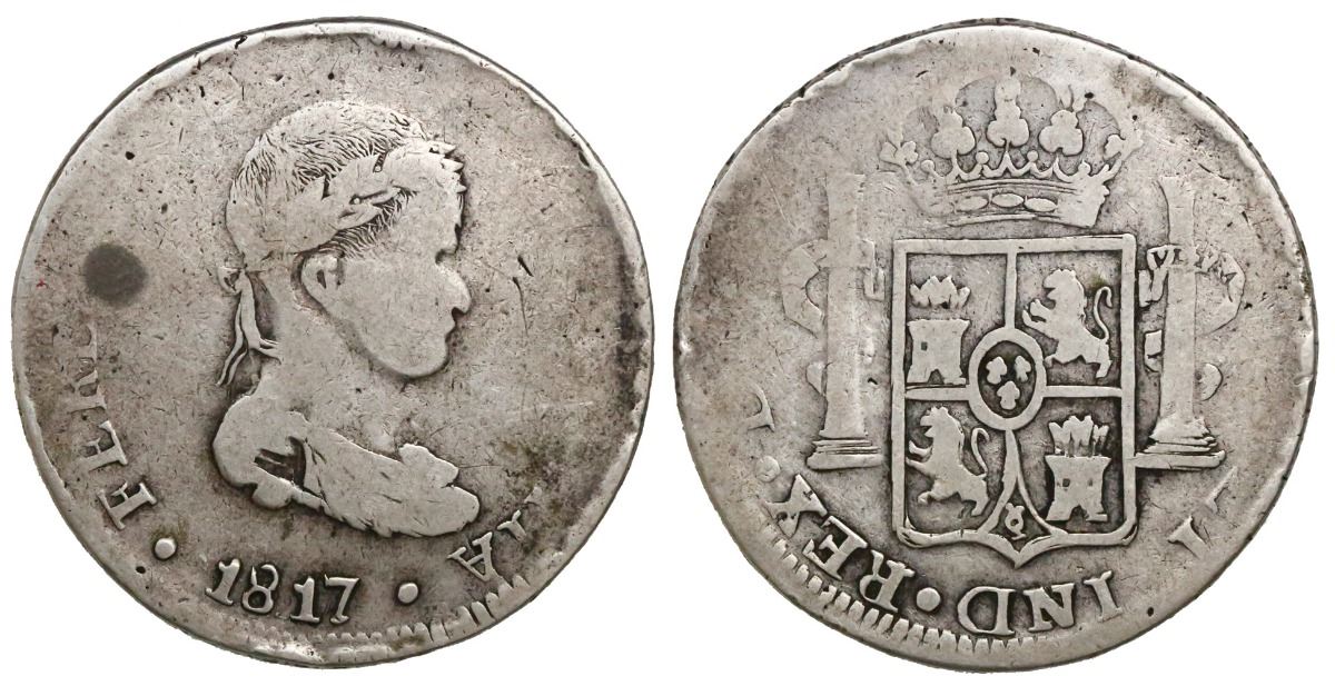 Durango, Mexico, bust 8 reales, Ferdinand VII, 1817MZ. CT-415; KM-111.2. 26.44 grams. Unevenly struck VG/F, with toning around details and spot of black on obverse.