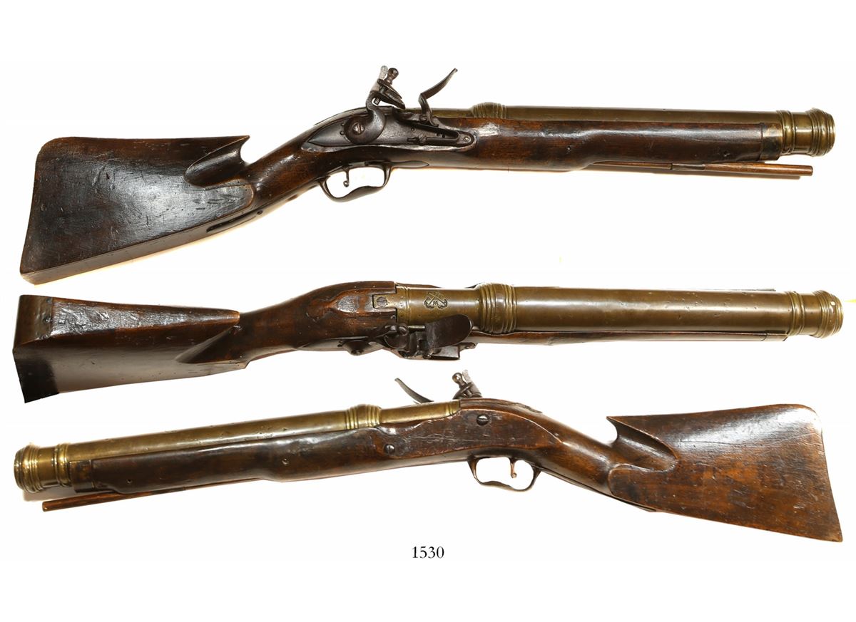 Dutch Admiralty flintlock blunderbuss, ca. 1720, very rare and important. 15 lb, 33-1/2" long. This is basically a handheld cannon, with massive 1-1/4"-bore reinforced brass barrel supported by extra-thick walnut stock (as thick as 2-1/2" at the butt), plain brass furniture and unengraved lock but stamped on barrel at breech with prominent Dutch admiralty logo consisting of the letters OADM (Admiralty on the Maas River), ivory sight at muzzle end, period replacement wooden ramrod and brass muzzle-band, otherwise untouched and original and highly desirable, first of its kind we have ever heard of. (Packing and shipping to be invoiced separately.)