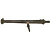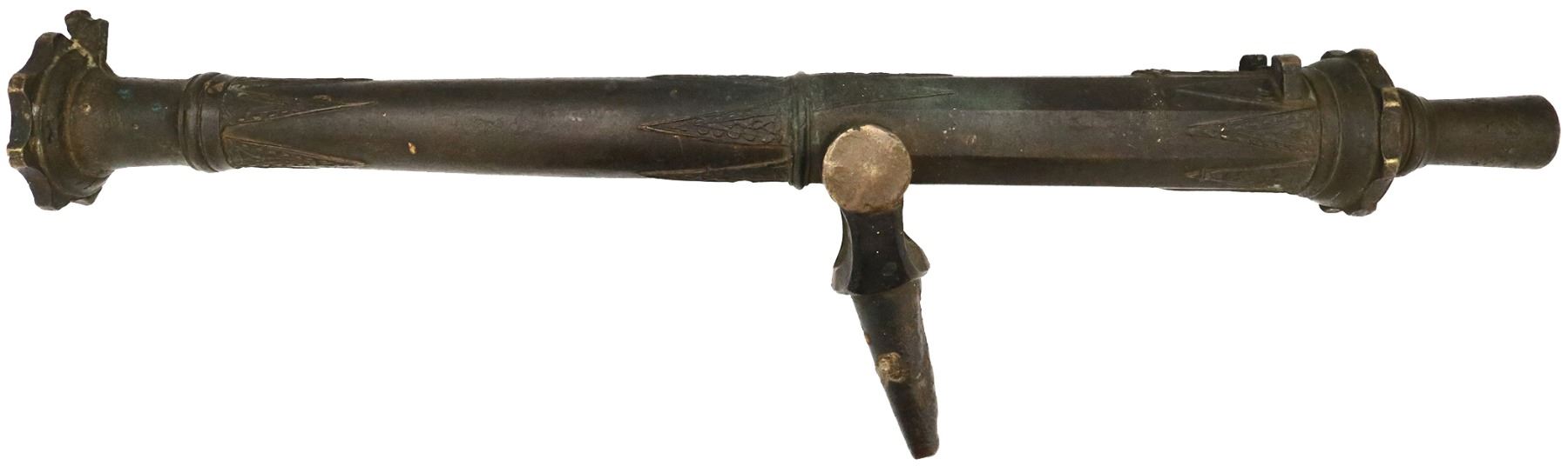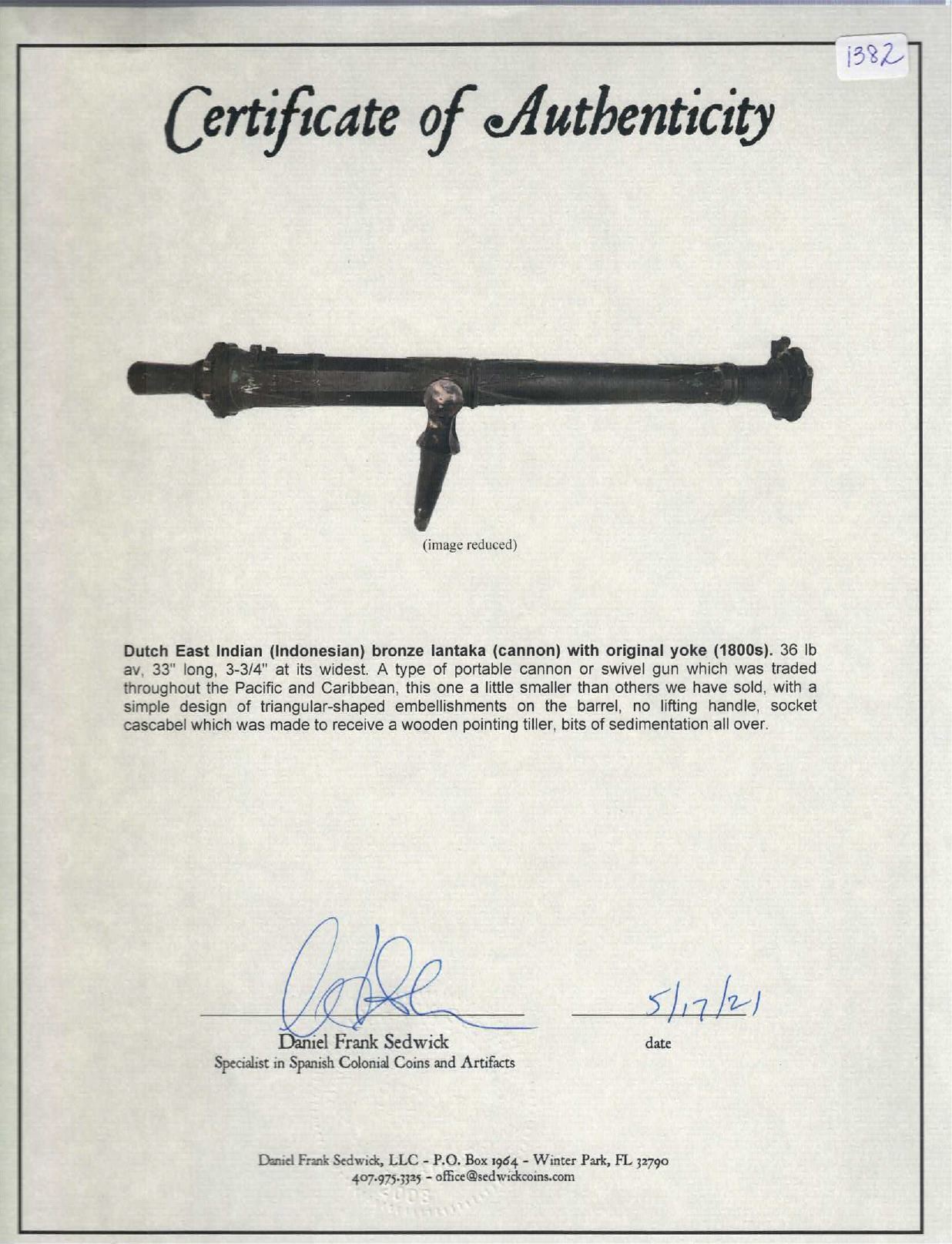 Dutch East Indian (Indonesian) bronze lantaka (cannon) with original yoke (1800s). 36 lb av, 33" long, 3-3/4" at its widest. A type of portable cannon or swivel gun which was traded throughout the Pacific and Caribbean, this one a little smaller than others we have sold, with a simple design of triangular-shaped embellishments on the barrel, no lifting handle, socket cascabel which was made to receive a wooden pointing tiller, bits of sedimentation all over. (Special shipping applies; pickup in person recommended.) With Sedwick photo-certificate.