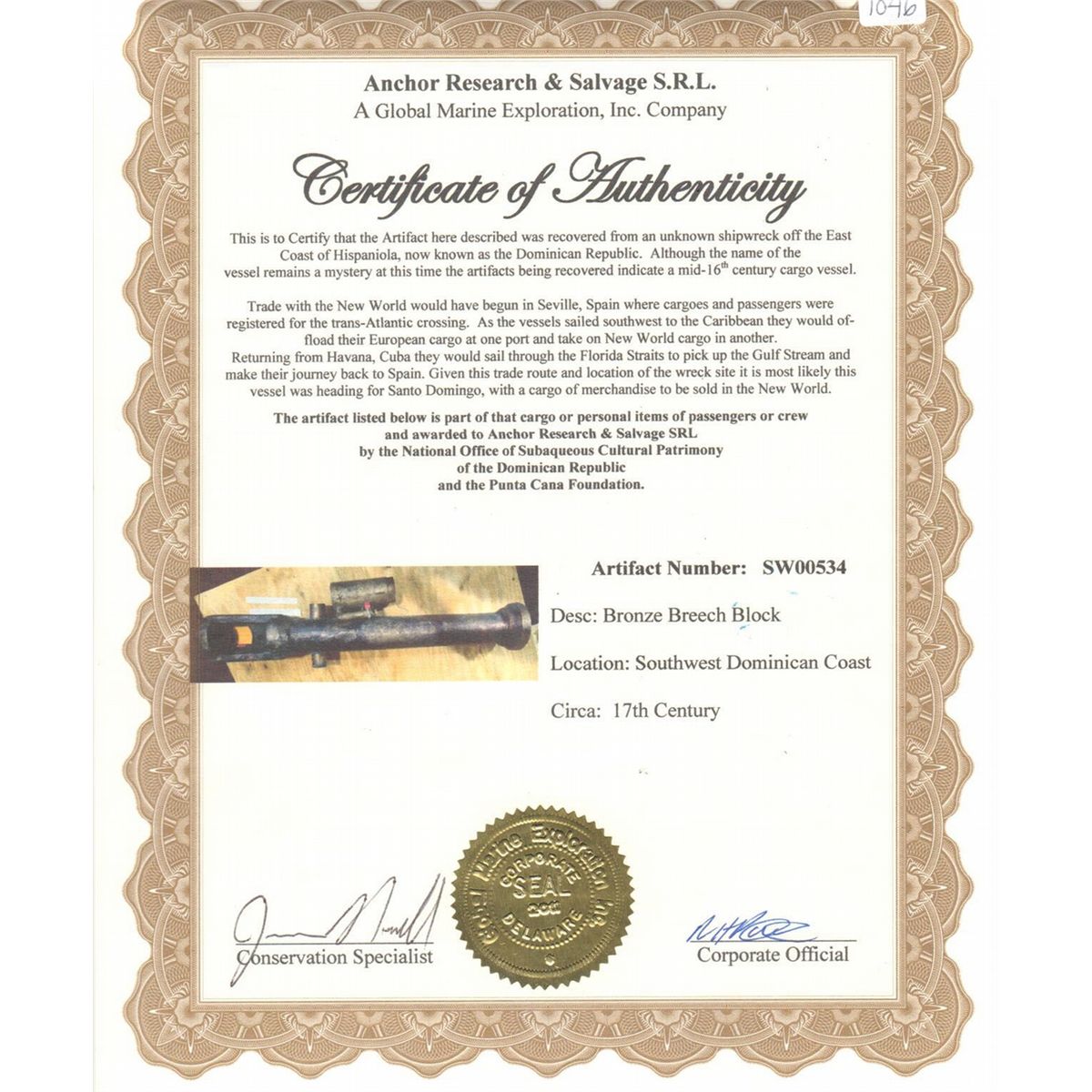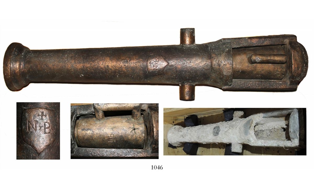 Dutch bronze breech-loading swivel cannon and matching breech-block, both marked NB (very rare as a matching pair). Cannon: 185 lb av, 45" long and diameter up to 7"; breech-block: 34-1/2 lb av, 8-1/2" long and diameter up to 4". Shipwreck bronze cannons are rather scarce overall, and small ones like this that are a manageable size and weight are in high demand. What you never see is a matching set of cannon and breech-block like we have here (the block actually found inside the cannon on site), proven by the fit and the markings, which consist of the letters N and B (possibly for Nederlandse Brons = Netherlands Bronze) separated by an odd-shaped ornament, the marking on the cannon also below a cross of Jerusalem and on a raised shield-shaped crest. The breech-block also has a star-shaped mark on the touch-hole, as if to point out where it is to the gunner, and is slightly lighter (brassier) in color than the cannon itself, which measures 6-1/2" across the muzzle, 3" bore and 9" trunnion to trunnion, also with slots behind the breech to hold the block in place and with hole at cascabel end for receiving a tiller handle. Both pieces are completely conserved on the exterior but bear coral encrustation on the inside. From an unidentified 1500s-1600s wreck off Santo Domingo, with Global Marine Exploration photo-certificates #SW00340 and 534. Recovered from: Unidentified 1500s-1600s wrecks off Santo Domingo