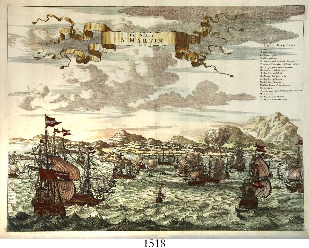 Dutch copperplate engraving "De Stadt St. Martin," depicting Admiral Martyn Thytzoon's 16-ship Dutch